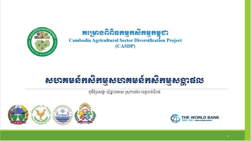 ហិរញ្ញប្បទានឥតសំណងបំពេញបន្ថែមទុនវិនិយោគ៤០% តាមរយៈគម្រោងពិពិធកម្មកសិកម្មកម្ពុជា គាំទ្រដោយធនាគារពិភពលោក (World Bank) និងអនុវត្តដោយអន្តរក្រសួង រួមមាន ក្រសួងសេដ្ឋកិច្ច និងហិរញ្ញវត្ថុ ក្រសួងកសិកម្ម រុក្ខាប្រមាញ់ និងនេសាទ ក្រសួងអភិវឌ្ឍន៍ជនបទ និងក្រសួងធនធានទឹក និងឧតុនិយម មានគោលបំណងសម្របសម្រួលខ្សែច្រវាក់តម្លៃពិពិធកម្មកសិកម្ម នៅក្នុងតំបន់ភូមិសាស្រ្តគោលដៅគម្រោង១៨ខេត្តក្រុងនៃប្រទេសកម្ពុជា។